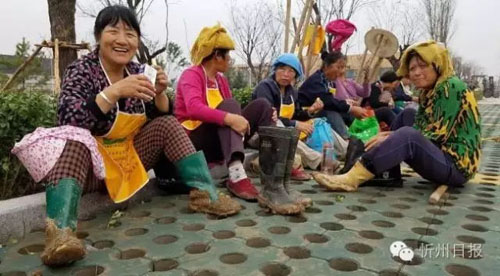《綠化娘子軍的早餐》,在忻州一中北校區(qū),戰(zhàn)斗了一個(gè)早晨,搶時(shí)間、搶速度進(jìn)行植樹的康培綠化公司的娘子軍在吃早飯,補(bǔ)充體力。(黃濤 攝)