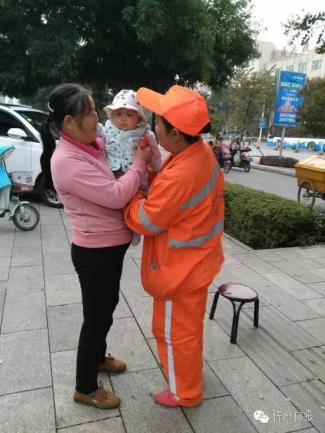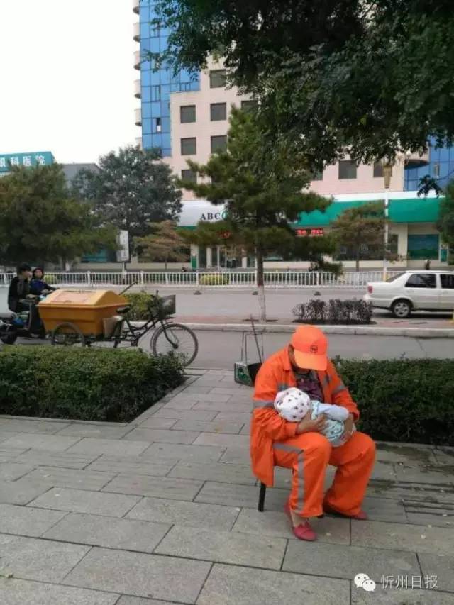 (五)創(chuàng)衛(wèi)工作如火如荼,環(huán)衛(wèi)女工扔下嗷嗷待哺的女兒投身在創(chuàng)衛(wèi)工作。環(huán)衛(wèi)女工正在清掃路面垃圾,母親帶孩子來找她喂奶,孩子吃飽后,又把孩子交給母親,邊鏟除口香糖,邊望著遠去的親人,滿臉的依依不舍。(董蘊宜 攝)