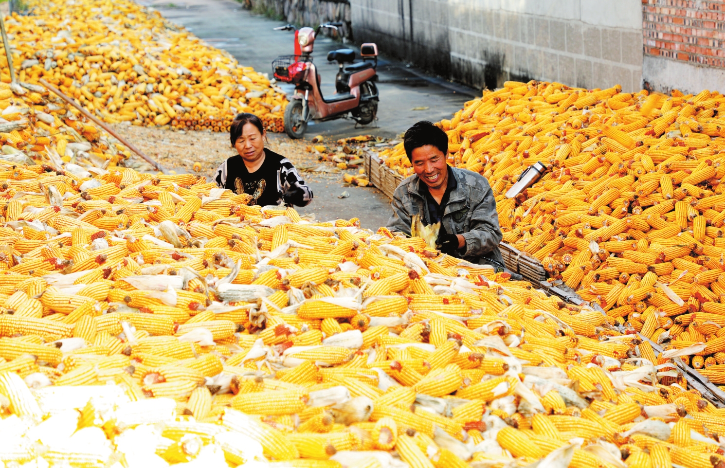 近日,原平市新原街道桃園村村民緊抓晴好天氣晾曬玉米,農家場院呈現出一派喜人的豐收景象。(