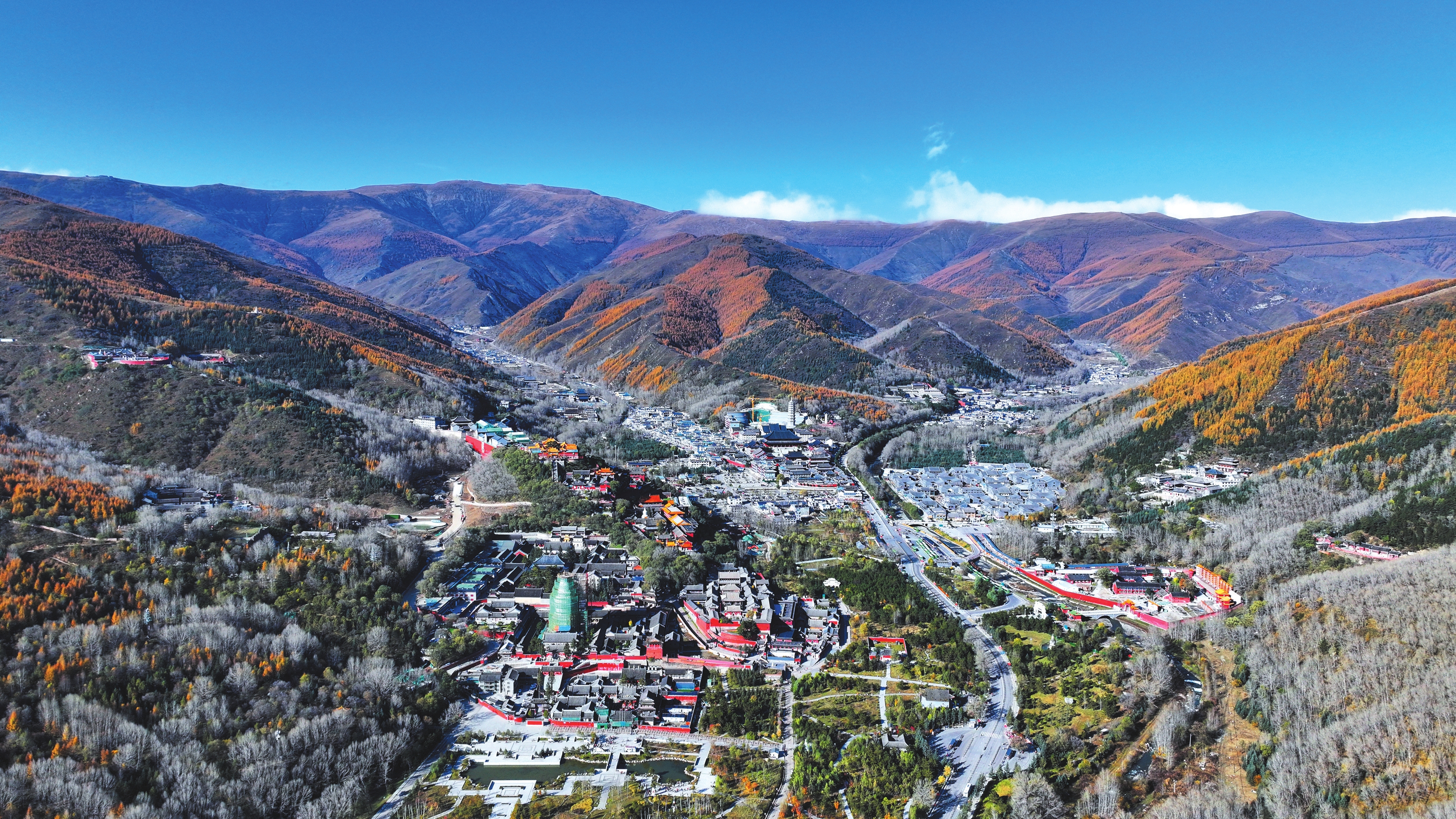 古建筑群為這幅秋景增添了人文底色。顯通寺的古剎紅墻與墻外的五角楓形成鮮明對(duì)比,楓葉的赤紅與墻體的赭紅在陽(yáng)光下交融;塔院寺大白塔的鎏金頂在陽(yáng)光下熠熠生輝,與周邊金黃的楊樹(shù)林構(gòu)成“金頂耀金秋”的壯麗畫(huà)面。