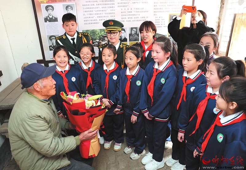 3月27日,忻州市七一路小學組織黨員、少先隊員走進忻府區(qū)官莊村原忻縣(西)第一個紅色黨支部官莊黨支部舊址,開展“傳承紅色薪火,爭做新時代好隊員”主題活動,追憶崢嶸歲月,感悟革命精神。圖為老兵武三毛給孩子們講述抗戰(zhàn)故事。(記者 張存良攝