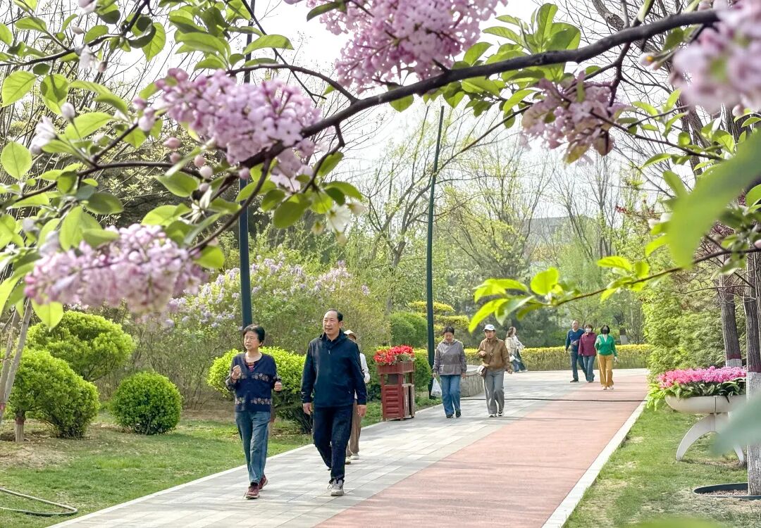 移步城中各大公共空間,更是一步一景:體育公園的桃杏花層層疊疊,迎來最佳觀賞期,粉白色的花瓣綴滿枝椏,與跑道上奔跑的身影相映成趣;人民公園的玉蘭花、碧桃、西府海棠次第開放,映著湖面的波光,岸邊垂柳抽出新綠,與繁花共同構(gòu)成層次豐富的春日圖景;遺山公園里,山桃、丁香香氣彌漫,市民三五成群,沿著步道悠然散步;古城西園的花開得繁盛熱烈,朱紅的古建檐角襯著艷而不俗的花簇,盡顯晉北古城的春日風(fēng)韻;作為城市生態(tài)名片的云中河景區(qū),步道兩側(cè)的繁花映水,偶有水鳥掠過水面,漾出一岸花影。