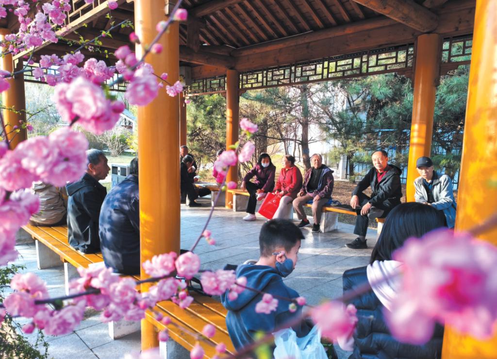 市民漫步遺山公園樂享春光。范琛攝
