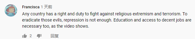 “任何國家都有權(quán)利和義務(wù)打擊宗教極端主義和恐怖主義。要根除這些邪惡……教育和獲得體面工作的機會也是必要的?!苯?,一名海外網(wǎng)友Francisca在看完中央廣播電視總臺旗下CGTN播出的《巍巍天山——中國新疆反恐記憶》紀(jì)錄片后這樣評價。