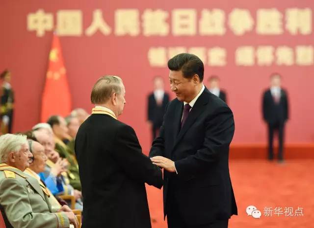2015年9月2日,習(xí)近平在北京人民大會(huì)堂向30名抗戰(zhàn)老戰(zhàn)士老同志、抗戰(zhàn)將領(lǐng)、幫助和支持中國抗戰(zhàn)的國際友人或其遺屬代表頒發(fā)中國人民抗日戰(zhàn)爭(zhēng)勝利70周年紀(jì)念章并發(fā)表重要講話。新華社記者 謝環(huán)馳攝