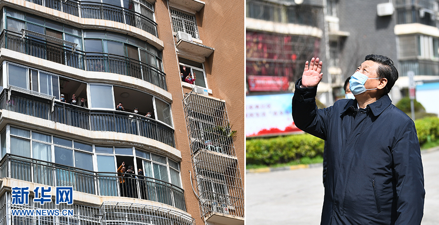 3月10日,習(xí)近平專門赴湖北省武漢市考察新冠肺炎疫情防控工作。這是習(xí)近平在東湖新城社區(qū)考察時,向在家隔離居住的居民揮手致意、表示慰問(拼版照片)。 新華社記者 謝環(huán)馳 攝