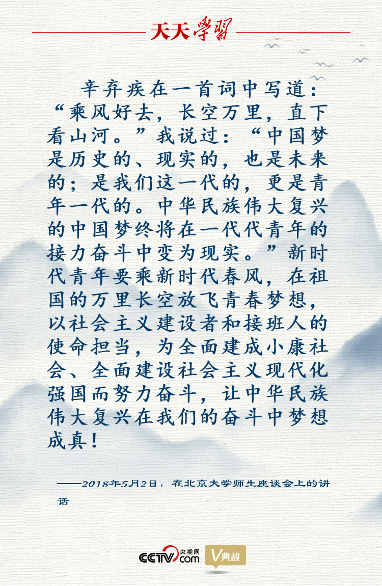 2018年5月2日,在北京大學(xué)師生座談會(huì)上,習(xí)近平總書記引用了辛棄疾這句意境宏闊的中秋詞句,號(hào)召新時(shí)代青年要乘新時(shí)代春風(fēng),在祖國(guó)的萬(wàn)里長(zhǎng)空放飛青春夢(mèng)想。