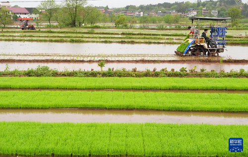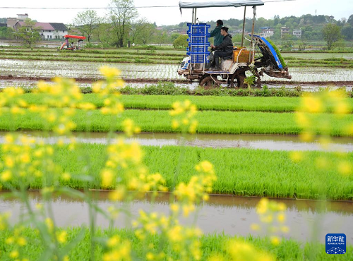 4月11日,湖南省衡陽(yáng)市祁東縣金橋鎮(zhèn)村民駕駛插秧機(jī)進(jìn)行早稻插秧工作。(新華社發(fā) 曹正平 攝)