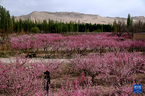 4月12日,游人在甘肅省敦煌市七里鎮(zhèn)桃產(chǎn)業(yè)示范基地游玩。(新華社發(fā) 張曉亮 攝)