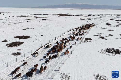 4月14日,山丹馬場(chǎng)的牧馬人組織馬群轉(zhuǎn)場(chǎng)(無(wú)人機(jī)照片)。(新華社發(fā) 王超 攝)