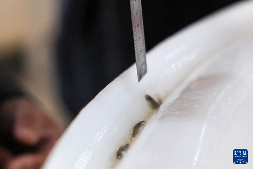 4月15日,工作人員在吉林延邊馬蘇大麻哈良種場繁育車間對(duì)魚苗進(jìn)行檢測、計(jì)數(shù)。(新華社記者 顏麟蘊(yùn) 攝)
