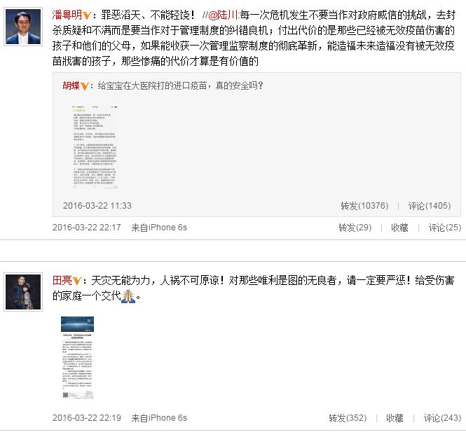 繼章子怡、賈乃亮等人在微博發(fā)聲關(guān)注疫苗安全問題后,3月22日晚,孫紅雷也在微博心痛呼叫“我的孩子……”任賢齊在微博中寫道:“請重視并嚴(yán)懲無良商人!別讓這些混蛋荼毒孩子們的健康!”舒淇、趙薇也排隊(duì)轉(zhuǎn)發(fā)并利用自身名人效應(yīng)呼吁。
