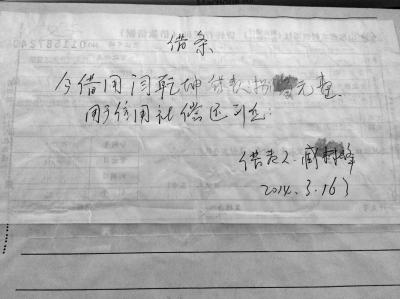 臧林峰給閆乾坤出具的“借條”。 截至8月28日,山東省成武縣南魯鎮(zhèn)的鮑言革等5名村民仍被關(guān)在成武縣拘留所。半個(gè)月前,他們和閆乾坤等另外6名村民被一輛中巴車?yán)M(jìn)了成武縣拘留所。 成武縣汶上法庭負(fù)責(zé)人稱,這5人因不履行法院判決還貸款而被司法拘留。村民則稱,他們近百萬元貸款被原南魯鎮(zhèn)信用社客戶經(jīng)理臧林峰截留挪用,他們未拿到貸款,故不愿還款。 據(jù)悉,臧林峰已被原單位解除勞動(dòng)合同,曾被警方以涉嫌違法發(fā)放貸款刑拘,后檢察院以事實(shí)不清、證據(jù)不足為由未予批捕。 □事件 申請7萬卻多貸出8萬 南魯鎮(zhèn)的11名村民8月11日凌晨坐火車前往北京。兩天前的8月9日,成武縣信用聯(lián)社(2014年5月改制為成武縣農(nóng)村商業(yè)銀行)起訴閆乾坤的案子剛開完庭,法庭未當(dāng)庭宣判。 閆乾坤家住南魯鎮(zhèn)閆堂村。2014年初,他準(zhǔn)備在濟(jì)南一處工地與朋友一起包工,但手頭資金不足,便想到南魯鎮(zhèn)信用社貸款,“當(dāng)時(shí)準(zhǔn)備貸六七萬元”。 當(dāng)年3月14日,閆乾坤和朋友一起來到南魯鎮(zhèn)信用社,找到負(fù)責(zé)貸款的客戶經(jīng)理臧林峰申請貸款,并提供了身份證、結(jié)婚證、戶口本以及兩個(gè)擔(dān)保人的身份證原件等材料。 按規(guī)定,信用社工作人員要到貸款人家中核實(shí)其還款能力及擔(dān)保人的擔(dān)保能力。但當(dāng)年3月16日上午,在還未見到調(diào)查人員時(shí),閆乾坤就接到了臧林峰的電話,“他說貸款已經(jīng)申請下來了,讓我去拿錢”。閆乾坤立即趕到信用社,見到了臧林峰。 談話錄音顯示,臧林峰多次稱,他給閆乾坤多貸了8萬元用于信用社內(nèi)部周轉(zhuǎn)利息,“最長一個(gè)月的時(shí)間還上”。閆乾坤要求臧林峰以信用社的名義給其寫一張收條做證明,臧林峰稱,“以我的名義就可以了,比信用社的名義強(qiáng)”。 但之后臧林峰又稱這8萬元錢用于信用社內(nèi)部轉(zhuǎn)賬,“因?yàn)榈棉D(zhuǎn)兩個(gè)(貸款)戶到期的款”。臧林峰多次明確告知閆乾坤,多貸出來的8萬元是信用社使用,并讓其放心,不會(huì)把他弄進(jìn)“黑名單”。 閆乾坤問臧林峰,“你們信用社利息還用轉(zhuǎn)嗎?”“收不上來的,超3個(gè)月了,來不了的這都是自己人,都認(rèn)識,不然不會(huì)給他們轉(zhuǎn)”,臧林峰回答稱,“主要是轉(zhuǎn)這個(gè)貸款,才多弄的這個(gè)錢?!?/p> 閆乾坤還問臧林峰為何不到他家里去調(diào)查,臧林峰稱,“調(diào)查啥,信用社都知道自己用的錢,又不是你們用的錢,這都是說好的,要不然也給你們辦不了”,“這都是給主任說好的”。 當(dāng)天,閆乾坤的銀行卡轉(zhuǎn)入15萬元。閆乾坤稱,基于對臧林峰客戶經(jīng)理身份的信任,他簽字同意臧林峰取走8萬元,將7萬元錢用在濟(jì)南包工。 臧林峰給閆乾坤寫的“借條”顯示:“今借用閆乾坤貸款捌萬元整,用于信用社償還利息”,落款日期為2014年3月26日。 閆乾坤被要求先承擔(dān)15萬元的利息,但兩個(gè)月后臧林峰仍說信用社還未周轉(zhuǎn)過來,8萬元需再用一段時(shí)間。又過了一個(gè)月,閆乾坤仍未拿到那8萬元,“信用社主任王忠旭說找臧林峰說說,盡快還給我,第三個(gè)月的利息讓臧林峰還”。 但又過了段時(shí)間,臧林峰失聯(lián)了。 貸到了款但未見到錢 閆乾坤后來了解到,從臧林峰處貸款出問題的并非他一人。南魯鎮(zhèn)李堂村村民劉啟平,因做生意需要,于2011年3月經(jīng)中間人介紹通過臧林峰貸款30萬元。 提交貸款所需各種證件后,劉啟平始終未等到銀行的調(diào)查人員。“幾天后他(臧林峰)直接讓我?guī)е鴵?dān)保人去信用社取貸款”,劉啟平稱,“當(dāng)時(shí)銀行讓我辦了一張卡,辦好后臧林峰說他替我操作,就把銀行卡要走了,后來又說卡先不給我了,信用社轉(zhuǎn)賬需要幾天?!?/p> 劉啟平認(rèn)為臧林峰是在履行職務(wù)行為,但之后他多次找到臧林峰,后者均稱錢還沒轉(zhuǎn)過來。至今,劉啟平也未見到這筆30萬元的貸款。 2014年2月23日,成武縣信用聯(lián)社將劉啟平起訴到法院,要求其償還26萬余元借款及利息。劉啟平又去找臧林峰,“他說貸的款讓他們挪用了,用于信用社將要出現(xiàn)的不良貸款和應(yīng)急利息”。 2014年6月24日,臧林峰又給劉啟平出具一份書面說明,上面寫著“用劉啟平30萬貸款歸還馬廟村馬進(jìn)秋貸款30萬元”。劉啟平了解到,有人替他還了4萬元貸款,“不是我還的,我也不知道是誰還的”。 成武縣法院于2014年10月29日對劉啟平貸款案作出的判決書顯示,劉啟平在法庭講述了前述貸款經(jīng)歷,至今未見到30萬元貸款,“原告從貸款到現(xiàn)在也一直沒向我催要過該筆借款”。 劉啟平出示了臧林峰給其出具的欠條等書面證據(jù)。 法院認(rèn)為,劉啟平辯稱自己沒有實(shí)際使用該筆借款,而是被臧林峰所用,自己不應(yīng)履行償還責(zé)任,但他認(rèn)可原告將30萬元匯入其賬戶,劉啟平將銀行卡交給臧林峰使用,臧林峰給其出具了欠條,這僅能證明劉啟平與臧林峰之間有借貸關(guān)系,并不能免除劉啟平償還原告借款的法律責(zé)任。法院判決劉啟平償還原告本金26萬余元及利息,另3名擔(dān)保人承擔(dān)連帶清償責(zé)任、有權(quán)向劉啟平追償。 劉啟平對法院判決不服,仍認(rèn)為自己沒用