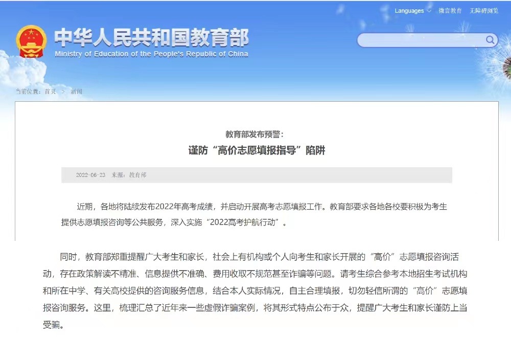 近日,教育部發(fā)布預(yù)警,提醒考生謹(jǐn)防“高價(jià)志愿填報(bào)指導(dǎo)”陷阱。有網(wǎng)站虛假宣傳擁有所謂“內(nèi)部信息”,自稱掌握內(nèi)部大數(shù)據(jù),能夠“精準(zhǔn)定位院校”等等。事實(shí)上,每年高考填報(bào)志愿前,各省級(jí)招生考試機(jī)構(gòu)都會(huì)發(fā)布當(dāng)年高考成績(jī)統(tǒng)計(jì)情況和近年來(lái)各高校錄取分?jǐn)?shù)情況,并不存在市面上的咨詢機(jī)構(gòu)或個(gè)人聲稱的“內(nèi)部信息”。還有一些咨詢機(jī)構(gòu)假冒所謂志愿填報(bào)專家身份。該咨詢機(jī)構(gòu)打出廣告,稱團(tuán)隊(duì)的專家“獲得高考志愿規(guī)劃師認(rèn)證”“來(lái)自著名高?!钡?。事實(shí)上,有關(guān)部門從未發(fā)放過(guò)“高考志愿規(guī)劃師”這類職業(yè)資格證書。該機(jī)構(gòu)一些所謂“志愿規(guī)劃師”都是臨時(shí)招募的社會(huì)人員,按照總部提供的“臺(tái)詞”給考生和家長(zhǎng)輔導(dǎo)。家長(zhǎng)購(gòu)買這些機(jī)構(gòu)的服務(wù)不僅花了冤枉錢,而且可能報(bào)錯(cuò)志愿。