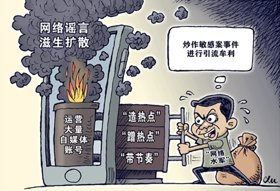 編造傳播虛假信息“造熱點”“蹭熱點”“帶節(jié)奏”,炒作敏感案事件進行引流牟利,開設假冒媒體網(wǎng)站和自媒體賬號,打著“輿論監(jiān)督”等旗號,實施敲詐勒索……這些行為被公安機關嚴厲打擊。徐駿/作(新華社發(fā))