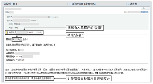 ——標題引誘+緊迫感逼單。歲末年初報銷忙、賬務(wù)急,境外攻擊者抓住結(jié)算封賬的時間點,偽裝成電信運營商、電商平臺或旅游平臺客服,以“收件人姓名+電子發(fā)票”為主題構(gòu)造釣魚郵件。其中郵件正文中還會特別強調(diào)“逾期作廢”“發(fā)票有誤需重開”等字樣制造緊迫感,降低警惕性,畢竟在不少人的潛意識里“一張發(fā)票能有多大危害”?但真正的陷阱就隱藏在附件或鏈接中,看似是一份普通的發(fā)票文件,實則是境外黑客組織精心偽裝的木馬程序。