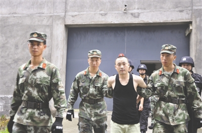 劉曉輝在法警的押解下走出看守所大門(mén)
