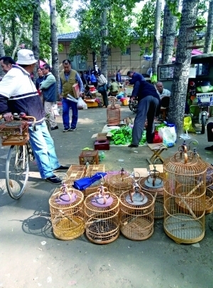 昨天上午,記者來到北沙灘橋附近,看到臨時集市藏身于一片楊樹林里,并被高高的圍墻圍了起來。樹林里賣鴿子的、賣小鳥的、賣魚的、賣蟲的、賣古玩的攤子應有盡有。其中,售賣小鳥的攤子有五六個,有的把鳥籠直接掛在樹上,有的則在地上鋪開來,幾十只鳥籠排成一排(如圖)。據(jù)了解,有護鳥志愿者在上周末拍到的圖片中,幾百只鳥兒被關在籠里售賣。
