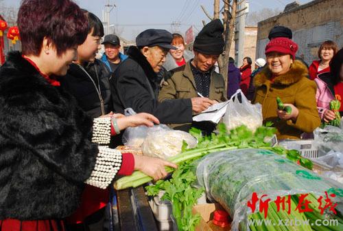 春節(jié)期間農(nóng)村市場(chǎng)依然旺,城里商家還要到村里賣菜。正月初三攝于代縣西馬村。(楊峻峰 攝)