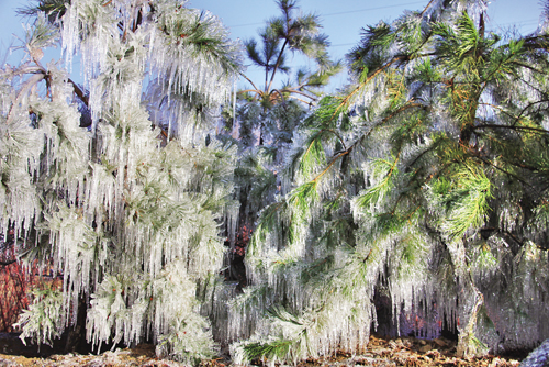 3月26日早晨,原平市交通公園的各種風(fēng)景樹木驚現(xiàn)樹掛冰凌奇觀,蔚為壯觀,吸引了市民前來(lái)觀賞。據(jù)了解,該樹掛冰凌是公園工作人員對(duì)各種花草樹木進(jìn)行春澆噴灌時(shí),由于早晨溫度較低,噴灌的霧狀水滴集結(jié)而成,到上午太陽(yáng)光照下,此奇觀已經(jīng)消失。(吉建平 攝)