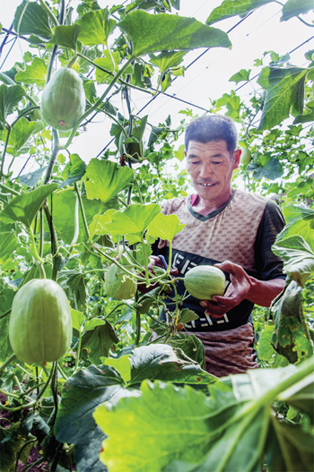 5 月14 日,忻府區(qū)部落村民在自家溫室大棚采摘甜瓜。他家種植溫室大棚甜瓜六七年了,今年采用了立體式種植甜瓜技術(shù),達(dá)到了甜瓜早上市、采摘時間長的目的,成了當(dāng)?shù)胤N植甜瓜的技術(shù)帶頭人。(曹建國 攝)