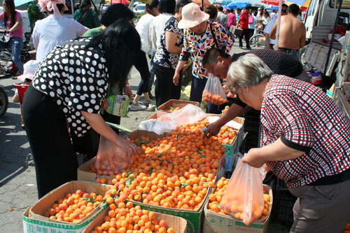 6月12日,被譽(yù)為大杏之村原平市解村鄉(xiāng)余家溝村的農(nóng)民正在集貿(mào)市場(chǎng)賣(mài)大杏,市民們正在挑選購(gòu)買(mǎi)很受青睞。該市大力發(fā)展一村一品水果種植栽培業(yè),多措并舉促進(jìn)了農(nóng)民增收。(趙春曉 攝)