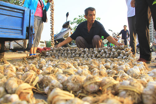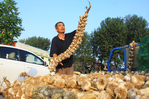 7月30日,原平市陽房村蒜農(nóng)正在農(nóng)產(chǎn)品市場銷售紫皮蒜。原平紫皮蒜是當(dāng)?shù)氐钠放妻r(nóng)產(chǎn)品,盛產(chǎn)于滹沱河沿岸的新原鄉(xiāng)和西鎮(zhèn)鄉(xiāng),不僅是調(diào)味佳品,而且食用具有藥用價值,省內(nèi)外客商慕名而來購買,深受歡迎。(吉建平 攝)