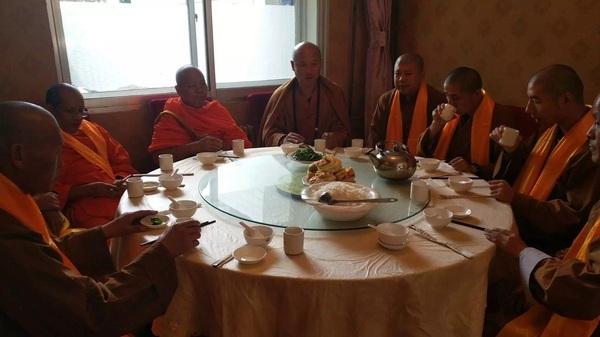圖為五臺(tái)山望海寺住持釋覺(jué)一法師與泰國(guó)僧人共進(jìn)午餐。