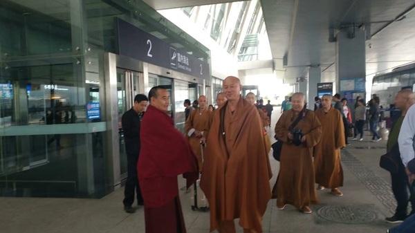 圖為五臺(tái)山望海寺住持釋覺(jué)一法師與弟子們順利到達(dá)西寧機(jī)場(chǎng),木蘭加措法師前往迎接。