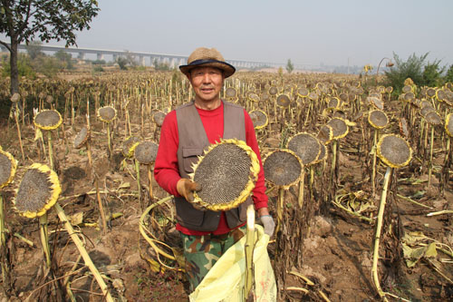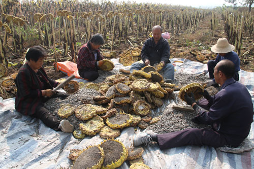10月13日,原平市解村鄉(xiāng)圪坨村林同種植專業(yè)合作社正在收獲向日葵,該社引進(jìn)三瑞公司種植1000余畝SH363向日葵喜獲豐收。近年來,該市積極引導(dǎo)農(nóng)民調(diào)整農(nóng)業(yè)產(chǎn)業(yè)結(jié)構(gòu),采取“合作社+農(nóng)戶”的模式,向日葵比玉米收入高四倍,銷售價每斤4塊左右,合作社為農(nóng)戶提供種子、種植技術(shù)等服務(wù),帶動當(dāng)?shù)厝罕娫鍪罩赂弧?span style="font-family: 楷體,楷體_gb2312, simkai">圖為解村鄉(xiāng)村民趁著秋高氣爽的晴好天氣,在田間地頭葵花籽的情景。(褚震 攝)