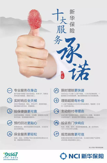 數(shù)十萬(wàn)新華人滿懷誠(chéng)意向您莊嚴(yán)宣誓“十大服務(wù)承諾”,竭誠(chéng)為您提供便捷、專業(yè)的保險(xiǎn)金融服務(wù)!