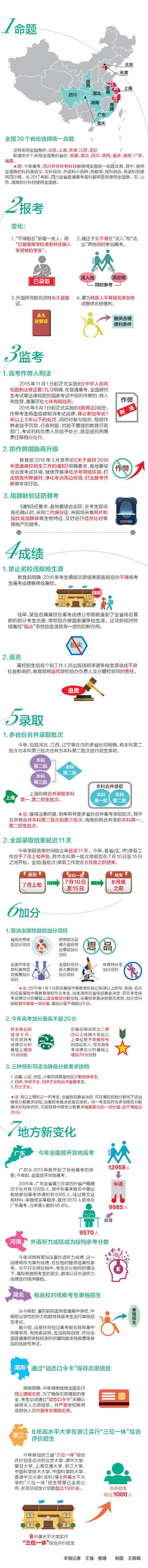 1命題 全國(guó)26個(gè)省份選擇統(tǒng)一命題 沒(méi)有采用全國(guó)卷的:北京、上海、天津、江蘇、浙江 新增的8個(gè)采用全國(guó)卷的省份:安徽、湖北、四川、陜西、重慶、湖南、廣東、福建。 ★附:今年高考,四川并非所有科目都使用全國(guó)統(tǒng)一命題試卷,其中,使用全國(guó)卷的科目是語(yǔ)文、文科綜合、外語(yǔ)科小語(yǔ)種,而數(shù)學(xué)、理科綜合、英語(yǔ)科則使用四川卷。從2017年起,四川全省普通高考各科都將全部使用全國(guó)卷。另,山東、海南部分科目使用全國(guó)卷。 2報(bào)考 變化: 1、“不得報(bào)名”新增一類人。即“已被高等學(xué)校錄取并保留入學(xué)資格的學(xué)生”。 2、隨遷子女不得在“流入”和“流出”兩地同時(shí)參加高考。 3、外國(guó)僑民報(bào)名須持永久居留證。 4、要為殘疾人平等報(bào)名參加考試提供合理便利。 3監(jiān)考 1.高考作弊入刑法 2015年11月1日起正式實(shí)施的《中華人民共和國(guó)刑法修正案(九)》明確,在普通高考、全國(guó)研究生考試等法律規(guī)定的國(guó)家考試中組織作弊的,將入刑定罪,最高可處七年有期徒刑。 2016年6月1日起正式實(shí)施的《教育法》規(guī)定,作弊考生將面臨被取消考試成績(jī)、停止參加考試1年以上3年以下的處罰,同時(shí)對(duì)參與組織、幫助作弊者給予罰款、行政拘留;對(duì)疏于管理的教育行政部門、考試機(jī)構(gòu)負(fù)責(zé)人員給予處分,甚至追究刑事責(zé)任等相應(yīng)處罰。 2.防作弊措施再升級(jí) 教育部2016年3月發(fā)布的《關(guān)于做好2016年普通高校招生工作的通知》明確要求,各地要綜合治理考試環(huán)境,繼續(xù)開(kāi)展凈化涉考網(wǎng)絡(luò)環(huán)境、打擊銷售作弊器材、凈化考點(diǎn)周邊環(huán)境、打擊替考作弊等專項(xiàng)行動(dòng)。 3.指靜脈驗(yàn)證防替考 《通知》還要求,各地要結(jié)合實(shí)際,在考生現(xiàn)場(chǎng)報(bào)名確認(rèn)時(shí),采用二代身份證,并現(xiàn)場(chǎng)采集照片和指紋或指靜脈等生物特征、及時(shí)進(jìn)行信息比對(duì)等措施嚴(yán)防替考。 |
