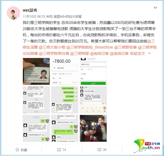 近日福建三明學院有學生發(fā)微博稱,自己與多名同學被誘騙貸款買手機,辦完貸款購機手續(xù)后,手機沒拿到卻背了一身債務(wù)。20名大學生總欠款額度達20多萬。