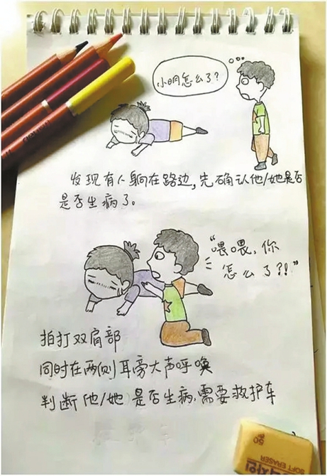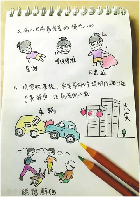 說(shuō)起畫(huà)這套漫畫(huà)的原因,何瑾說(shuō),這是從實(shí)際的工作出發(fā)得來(lái)的。有不少人不清楚怎么撥打120急救電話,有的人對(duì)撥打120的相關(guān)要求并不是很了解,想象和實(shí)際上還是有差距,通過(guò)漫畫(huà),讓更多的人了解正確撥打120急救電話的方法和步驟。(華西城市讀本記者陳伯強(qiáng) 受訪者供圖)