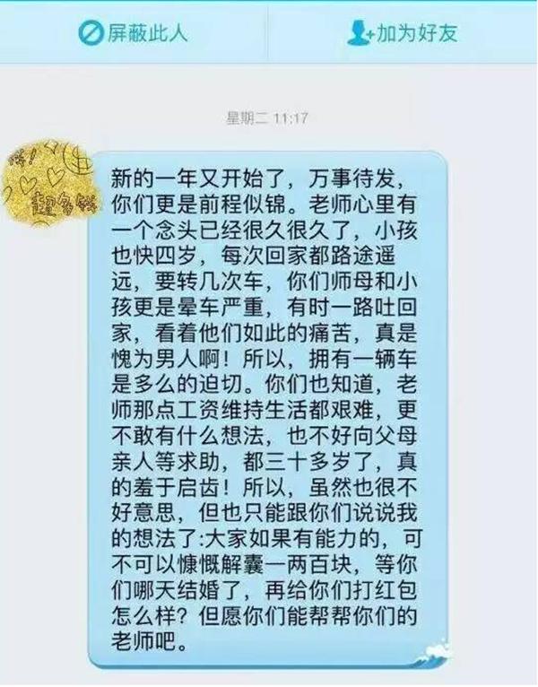網(wǎng)帖中還上傳了數(shù)張疑似該老師與學(xué)生的QQ聊天截圖,其中的一張截圖中的對話道出了老師“眾籌”買車的原因:“新的一年又開始了,萬事待發(fā),你們更是前程似錦。老師心里有個念頭已經(jīng)很久了,小孩也快四歲了,每次回家都路途遙遠(yuǎn),要轉(zhuǎn)幾次車,你們師母和小孩更是暈車嚴(yán)重,有時一路吐回家,看看他們?nèi)绱送纯啵媸抢槟腥税?!所以,擁有一輛車是多么的迫切。你們也知道老師那些工資維持生活都很艱難,更不敢有什么想法,也不好向父母親人求助,都三十多歲了,真的羞于啟齒!所以,雖然也很不好意思,但是也只能跟你們說說我的想法了:大家如果有能力的,可不可以慷慨解囊一兩百塊,等你們哪天結(jié)婚了,再給你們打紅包怎么樣?但愿你們能幫幫你們的老師吧?!?/p>