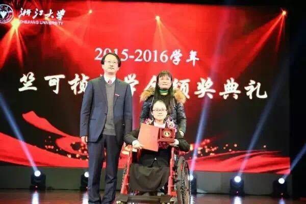 竺可楨獎(jiǎng)學(xué)金是浙江大學(xué)最高層次的獎(jiǎng)學(xué)金,要通過本人申請(qǐng),學(xué)院(系)推薦,校獎(jiǎng)學(xué)金評(píng)審委員會(huì)評(píng)定,每次評(píng)選全校范圍內(nèi)的研究生只有12個(gè)名額。在2016年10月份公布的獲獎(jiǎng)?wù)咧?,葉沈俏名列其中?!白约核惚容^幸運(yùn)的,還能看書,可以打字?!比~沈俏說,“同學(xué)和老師還是很關(guān)愛我的,努力學(xué)習(xí)、認(rèn)真科研是向他們表達(dá)感謝的手段,這也是我最好的興趣。”圖為浙江大學(xué)校長(zhǎng)吳朝暉為葉沈俏頒發(fā)竺可楨獎(jiǎng)學(xué)金。