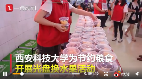 西安科技大學(xué)為節(jié)約糧食開(kāi)展了光盤換水果的活動(dòng),學(xué)生們只要把飯菜吃完清盤,就可以換到一份飯后果盤和代金券。校方介紹,他們每餐準(zhǔn)備了500份水果,該活動(dòng)推出之后,收餐量減少了40%到50%。