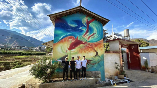 劉小備(左一)和團隊伙伴在墻繪前合影。受訪者供圖