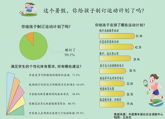 這個暑假,許多家長把運動計劃列入了孩子的假期計劃里,游泳、羽毛球、網球、籃球……多樣的選擇,映射的是青少年體育不斷增長的需求。 近日,中國青年報社社會調查中心聯(lián)合問卷網(wenjuan.com),對2002名家長進行的一項調查顯示,這個暑假,90.1%的受訪家長給孩子制訂了運動計劃。71.2%的受訪家長期待開放更多可供青少年鍛煉的場所和設施,64.6%的受訪家長建議鼓勵孩子們嘗試不同的鍛煉方式和運動項目。 調查中,20.9%的受訪家長孩子處于幼兒園及以下階段,孩子在小學階段的占44.5%, 初中的占21.5%,高中的占13.0%。 這個暑假,90.1%受訪家長給孩子制訂了運動計劃 “學校要求下載一個運動軟件,體育老師要求我們每天打卡,沒有打卡的孩子老師都會在群里提醒?!鄙綎|濟南五年級學生家長于晴(化名)說,“之前都是家長自愿打卡,暑假開始后,老師就盯得特別緊,體育老師和班主任一起盯,更加關注孩子們的鍛煉情況”。 這個暑假,90.1%的受訪家長給孩子制訂了運動計劃。 80后媽媽凌彥(化名)的大兒子開學上初二,小兒子在上幼兒園?!拔壹液⒆蛹磳⒁D到北京上學,北京對體育的要求更高,初二就有一個分值10分的體育考試,這10分要納入到他的中考成績里去?!绷鑿┱f,現(xiàn)在家長對孩子們的體育要求越來越高了,“我認識的一個家長孩子才剛四年級,就請了專門的體育老師教孩子跳繩”。 于晴說,學校要求下載的運動軟件里,有開合跳、跳繩、仰臥起坐、高抬腿等,老師想讓孩子們鍛煉的項目都布置在上面,比如說跳繩一天400個,仰臥起坐一天120個,開合跳120個,加起來運動量還是挺大的。“通過軟件,孩子可以自己完成打卡。比如仰臥起坐,軟件可以檢測到動作幫忙計數(shù),如果仰臥起坐時胳膊沒有碰到膝蓋,動作不標準就不計入。50米跑步時,軟件里有個模擬軌道,如果跑偏了也不算”。 凌彥給孩子制訂的暑期運動計劃,基本是按照中考項目來的,孩子每天都得練,考試的那些項目都要練到,“我每天晚上帶著孩子出去練習,讓孩子‘青蛙跳’‘鴨子走’,研究立定跳遠怎么才能跳得遠,讓他憋氣提高肺活量。除此之外,我家孩子從小學就開始打籃球,現(xiàn)在還在每周上籃球課”。 調查中,51.4%的受訪家長給孩子安排了跑步或跳操等運動,42.3%的受訪家長給孩子安排了打籃球等集體活動,39.9%的家長安排了散步、遠足登山等活動,38.1%的家長讓孩子自主安排鍛煉項目與時間,22.0%的家長安排了跳遠、實心球等中高考體育項目的鍛煉,20.3%的家長讓孩子觀看體育比賽,增強對體育運動的喜愛,19.6%的家長給孩子報名健身房、訓練營等。 “孩子在暑假參加了一個軍事化管理的夏令營,是為了鍛煉身體素質,增強自信心、自律能力。”于晴介紹,夏令營的老師發(fā)的視頻中,訓練項目有站軍姿、擒拿格斗等,早上6點半起床跑操,7點半吃飯,吃完飯后繼續(xù)訓練,一天大概有4個小時的訓練時間,這7天里孩子的運動量還是很大的。 北京師范大學教授毛振明認為,中小學生在暑假鍛煉身體首先要因地制宜,“所謂因地制宜就是根據暑期的日程安排制訂計劃。如果是跟家人一起去旅游,就盡可能利用住賓館的時間進行鍛煉,比如走路、跳繩、俯臥撐、全蹲等,走路是有氧運動,跳繩可以練心肺和身體靈敏性、下肢力量,俯臥撐可以練上肢,全蹲可以練下肢”。 71.2%受訪家長建議開放更多可供青少年鍛煉的場所和設施 為滿足學生的個性化體育需求,71.2%的受訪家長期待開放更多可供青少年鍛煉的場所和設施,64.6%的受訪家長建議鼓勵孩子們嘗試不同的鍛煉方式和運動項目,58.4%的受訪家長建議豐富校內體育課程的內容和形式,48.1%的受訪家長希望為孩子安排靈活多樣的暑假體育作業(yè)。 “我家孩子前段時間在學校里參加了跆拳道社團,練跆拳道的同時跑步也會快很多。”于晴鼓勵孩子多參加一些學校里的社團,“學校里有籃球社團、跆拳道社團,還有足球、乒乓球、高爾夫等,放學以后免費讓孩子們鍛煉,可以隨便報名。線上App也能夠監(jiān)督孩子運動,省力省事,比較方便”。 毛振明說,暑期孩子們的個性化運動,得家長們自己把握。差什么練什么,比如速度差就多練點速度,力量差就多練點力量,需要自己去發(fā)現(xiàn),找到個性化的問題?!笆钇阱憻捑褪且鶕綍r的情況,無論是老師說的,還是對照學生體質健康標準發(fā)現(xiàn)的,找到自己的弱項、短板進行鍛煉。當然還要考慮孩子本身的興趣點,這是必須的”。 “孩子學校在大課間會要求學生鍛煉,早上也會要求跑圈?!绷鑿┱f,孩子們在學校的運動時間還是可以保障的,但運動項目比較單一,沒有自由運動的時間,很多運動做得也不規(guī)范,比如,在做操的時候交頭接耳,不會一板一眼地鍛煉身體。凌彥希望校內的體育活動更加豐富,有更強的軟硬件設施和師資,幫助孩子們科學鍛煉。 毛振明建議,家長可以去網上搜集科學的鍛煉方式,跟孩子一起練,以身作則,這樣效果會非常好。(中國青年報記者 王品芝 實習生 尚佳) (責任編輯:蔡文斌) |