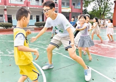 2022年暑期,武漢大學(xué)的大學(xué)生志愿者來到江西省南昌市灣里管理局羅亭鎮(zhèn)義坪小學(xué)參加“童心港灣”關(guān)愛留守兒童活動(dòng)。圖為志愿者和留守兒童一起做游戲。新華社發(fā)