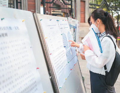 二○二二年七月七日,二○二二年上海市普通高等學校招生統(tǒng)一文化考試開考,五萬多名考生奔赴考場。圖為上海格致中學考點,考生查看考場信息。 王 初攝(人民視覺)