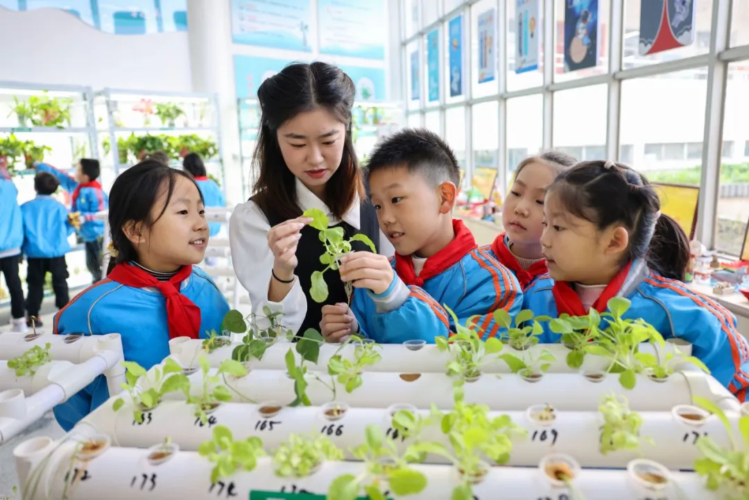 2024年11月21日,在湖北省襄陽市大慶路小學“校園農場”,老師正在講解水培植物的相關知識。聶志鵬 付小方 攝