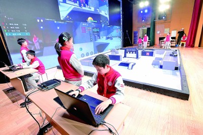 北京市海淀區(qū)實驗小學的學生在操控機甲機器人進行對抗比賽。新華社發(fā)