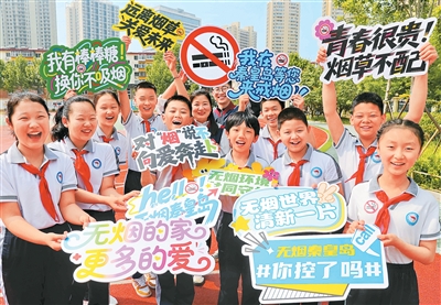 第38個“世界無煙日”到來之際,河北省秦皇島市疾控中心(市衛(wèi)生監(jiān)督所)工作人員走進(jìn)秦皇島市第七中學(xué)玉龍灣校區(qū),為學(xué)生普及吸煙有害健康的相關(guān)知識。圖為工作人員和學(xué)生共同和禁煙標(biāo)識、標(biāo)語合影。曹建雄攝(人民視覺)