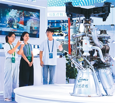 展區(qū)內(nèi),工作人員介紹焦點(diǎn)一號(hào)15噸液氮甲烷發(fā)動(dòng)機(jī)。陳冬冬攝