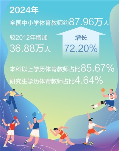 近年來,我國中小學(xué)體育教師隊伍不斷壯大。2024年全國中小學(xué)體育教師約87.96萬人,較2012年增加36.88萬人,增長72.20%。特別是近5年,全國體育教師數(shù)量增速明顯,師資補(bǔ)充力度加大。