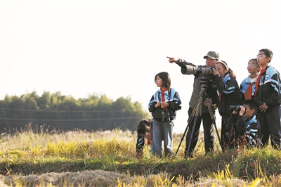 圖為在位于安徽省池州市的十八索省級自然保護(hù)區(qū),茅坦小學(xué)的學(xué)生在野生鳥類保護(hù)志愿者的帶領(lǐng)下用相機(jī)記錄鳥類。