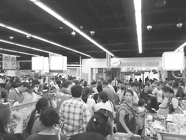 圖片說明: 烏蘭巴托8月初開業(yè)的一家韓國商場收銀臺前人滿為患,絲毫沒有危機氛圍。楊濤攝