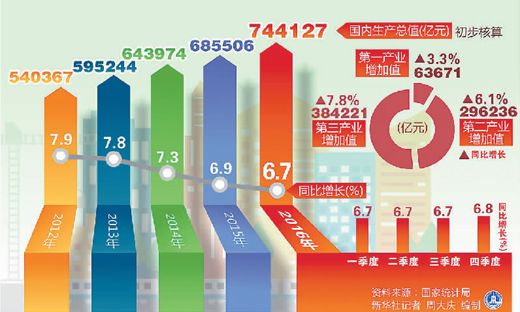 本報北京1月20日電 (記者陸婭楠)國家統(tǒng)計局1月20日公布,初步核算,2016年我國國內生產(chǎn)總值首次邁上“70萬億”臺階,為744127億元,按可比價格計算,比上年增長6.7%。
