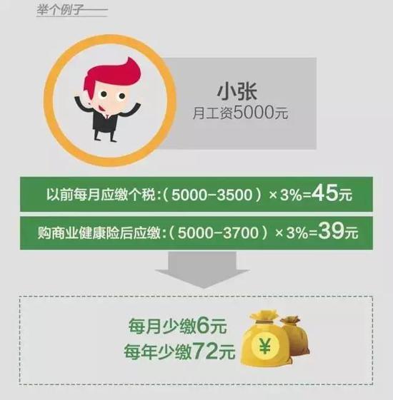可以抵扣多少?每年不超過2400元 《通知》指出對個人購買符合規(guī)定的商業(yè)健康保險產(chǎn)品的支出,允許在當(dāng)年(月)計算應(yīng)納稅所得額時予以稅前扣除 ,扣除限額為2400元/年,即200元/月。 同時《通知》指出,單位統(tǒng)一組織為員工購買或者單位和個人共同負(fù)擔(dān)購買符合規(guī)定的商業(yè)健康保險產(chǎn)品,單位負(fù)擔(dān)部分應(yīng)當(dāng)實(shí)名計入個人工資薪金明細(xì)清單,視同個人購買,并自購買產(chǎn)品次月起,在不超過200元/月的標(biāo)準(zhǔn)內(nèi)按月扣除。一年內(nèi)保費(fèi)金額超過2400元的部分,不得稅前扣除。以后年度續(xù)保時,按上述規(guī)定執(zhí)行。 也就是說,如果你購買的保險每個月分?jǐn)傁聛沓^200元,其實(shí)是相當(dāng)于你的個稅起征點(diǎn)提高了200元。